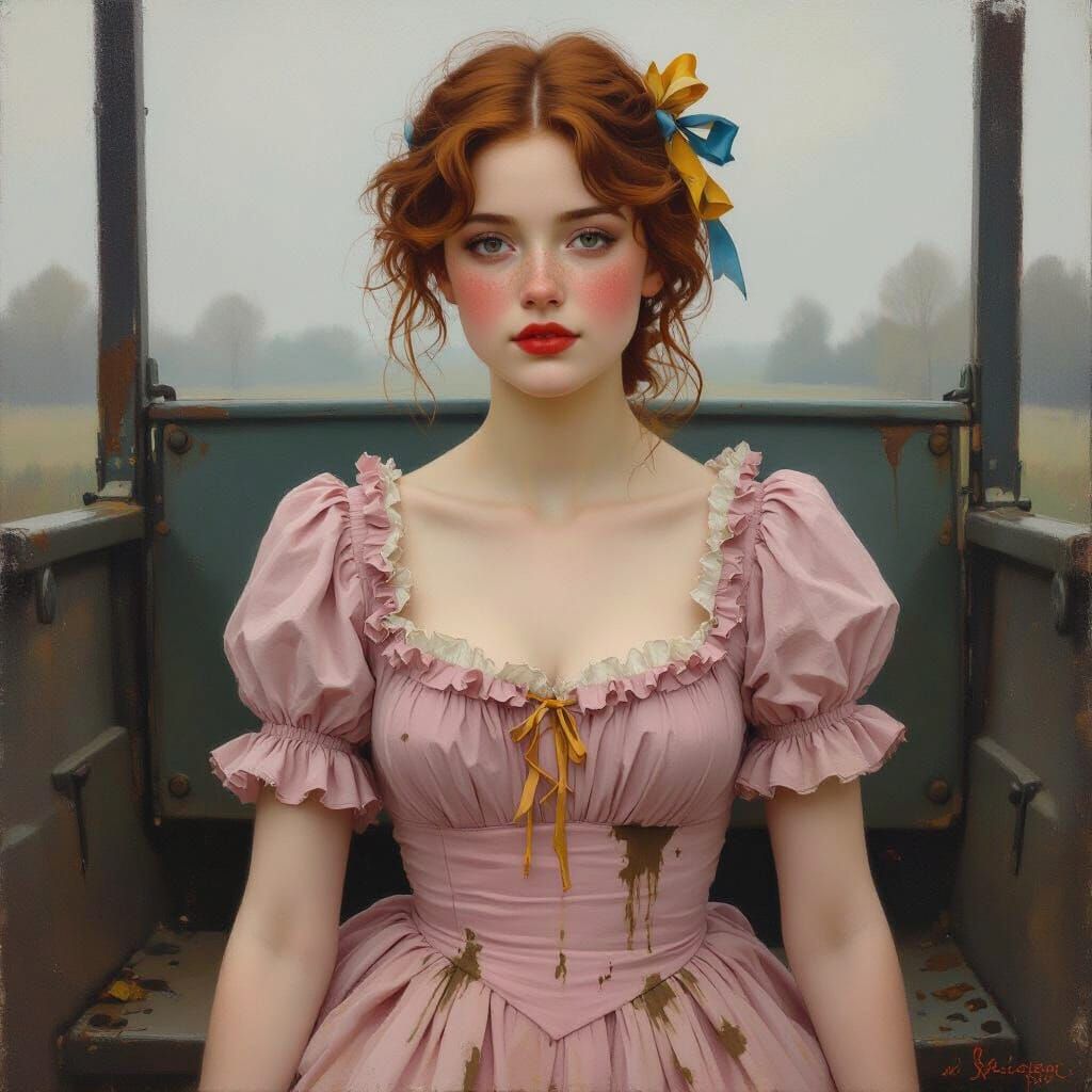 This image shows a young woman in a ruffled, mud-splattered pink dress, stepping down from a carriage bench on a gray morning. Rendered in an expressive acrylic painting style with visible brushstrokes.