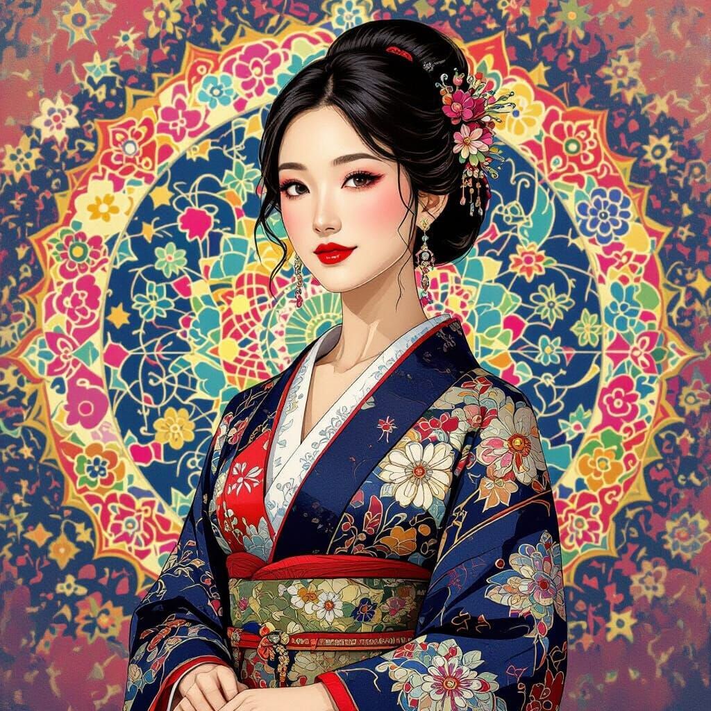 This image shows a woman in formal dress against a colorful, swirling backdrop. The artwork evokes a pop-surrealist aesthetic with bold lines and complex details.