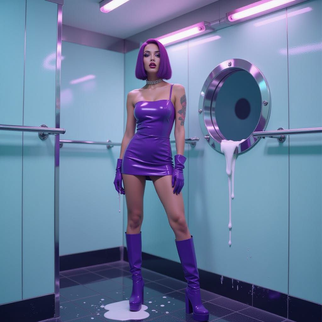This hyperrealistic image depicts a woman in a purple latex dress in a futuristic nightclub restroom. Yogurt drips from her mouth, with vivid colors and cinematic lighting creating a striking cyberpunk aesthetic.