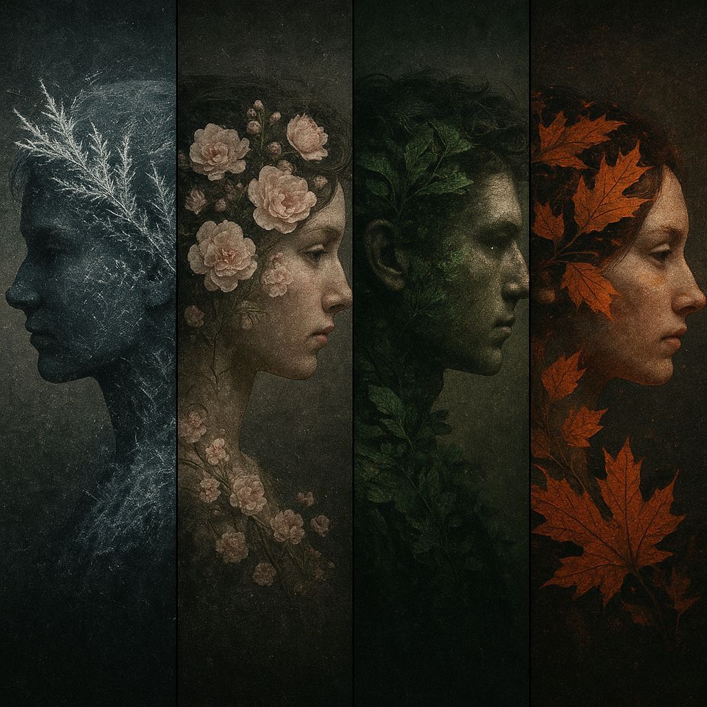 A surreal gothcore image showing four human silhouettes in vertical panels, each representing a season. The digital artifacts and chiaroscuro lighting create a moody, high-resolution aesthetic.