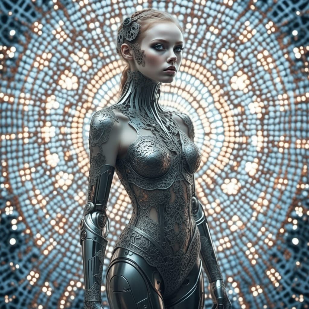 A full body portrait of a cyborg woman adorned in gothic lace, featuring dramatic dark eye makeup and long lashes.