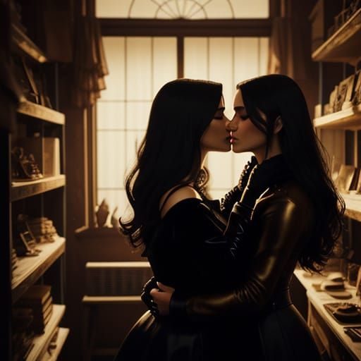This image shows two elegant women in a romantic, intimate moment, surrounded by the rich textures and dark colors of a cluttered, mystical boutique. Soft focus and warm lighting create a velvety, cinematic atmosphere.