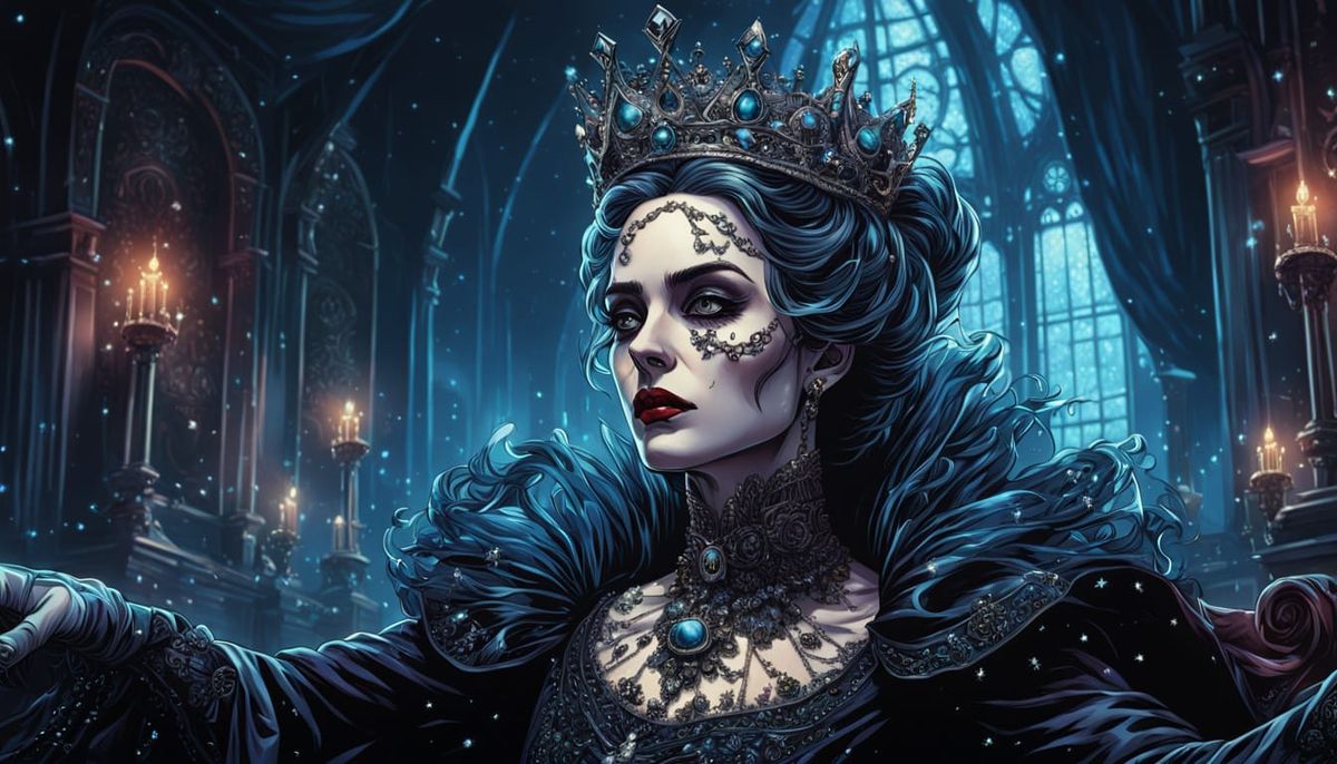 A striking picture of a Victorian villainess floating in a ballroom. Her porcelain skin is cracked, revealing dark energy, in a gothic surrealism style.