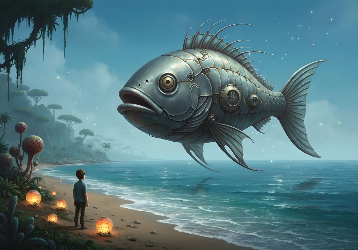 This image shows a colossal metallic fish with steampunk elements hovering above an alien shoreline, observed by a boy amidst exotic flora and magical lanterns. It is rendered as digital art.