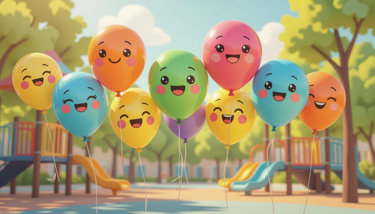 This image shows a collection of vibrant, whimsical balloons floating in a playground. Each balloon features a unique emoji-like face painted in black, rendered in a cute and kawaii style.