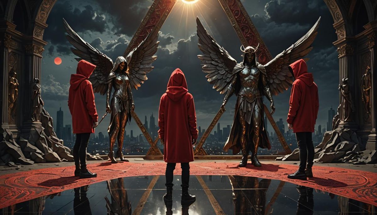 A digital painting showing an angel, a devil, and a human in a red hoodie standing in triangle formation before a large mirror. The background contrasts night and day in vivid, complementary colors.