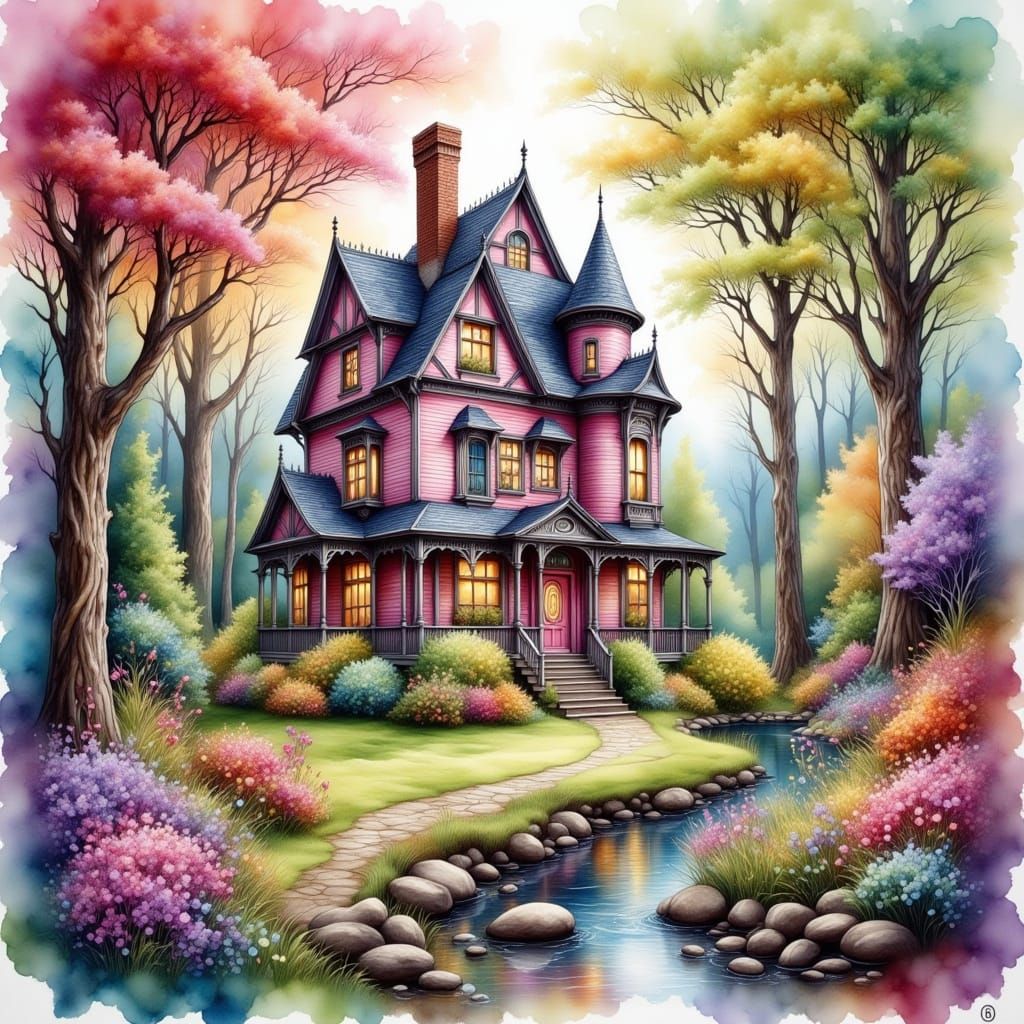 A dreamy watercolor of a hyper-detailed Victorian house nestled in a fairytale forest clearing beside a brook. Foxes play near a pink house with violet trim, all in soft focus.