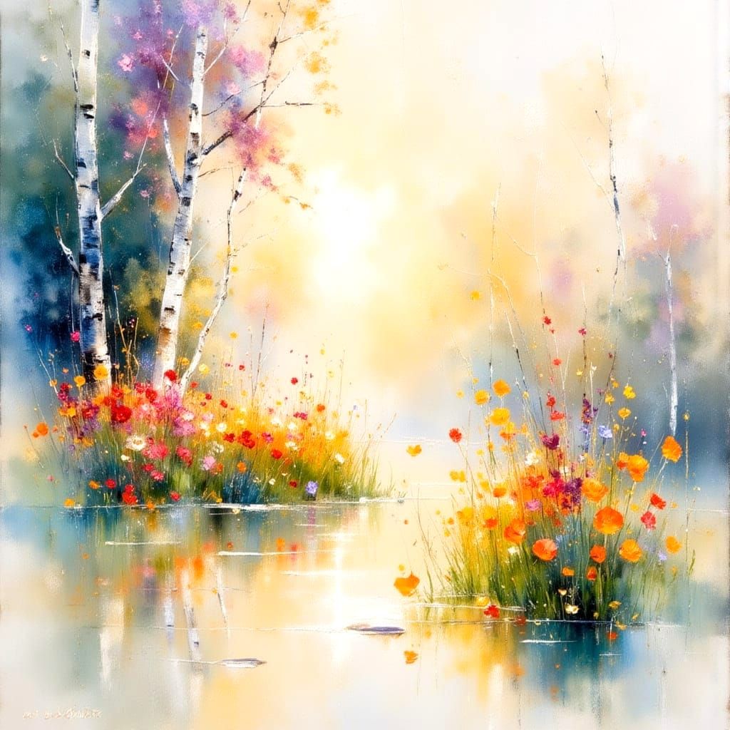This serene landscape painting features a delicate balance of warm sunshine and soothing rain, set amidst a dreamy, impressionist-inspired world with subtle, pastel hues and soft brushstrokes, evoking a sense of peaceful tranquility