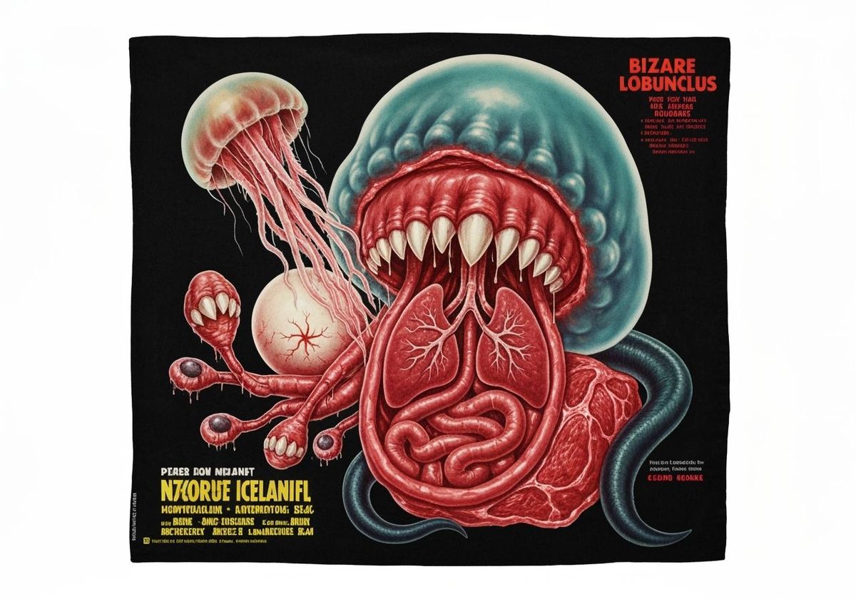 A surreal and brutal 1950s movie poster featuring a grotesque hybrid creature with elements of jellyfish, whale, and horse, evoking a sense of horror and anatomical disarray.