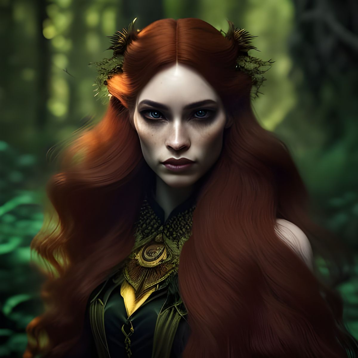 This image features a hyperrealistic, anthropomorphic tigress girl with striking brown-red hair and captivating, large expressive eyes, adorned with gothic jewelry and illuminated by golden electric light.