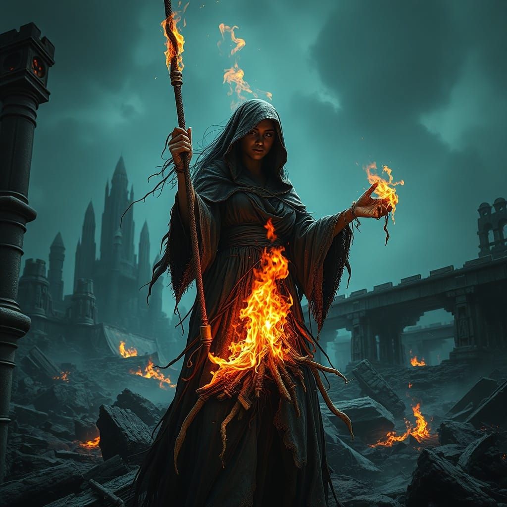 This image depicts a burning witch in tattered robes within an ancient, ruined setting. The art combines dark fantasy, mystical symbolism, and dramatic lighting for a cinematic effect.