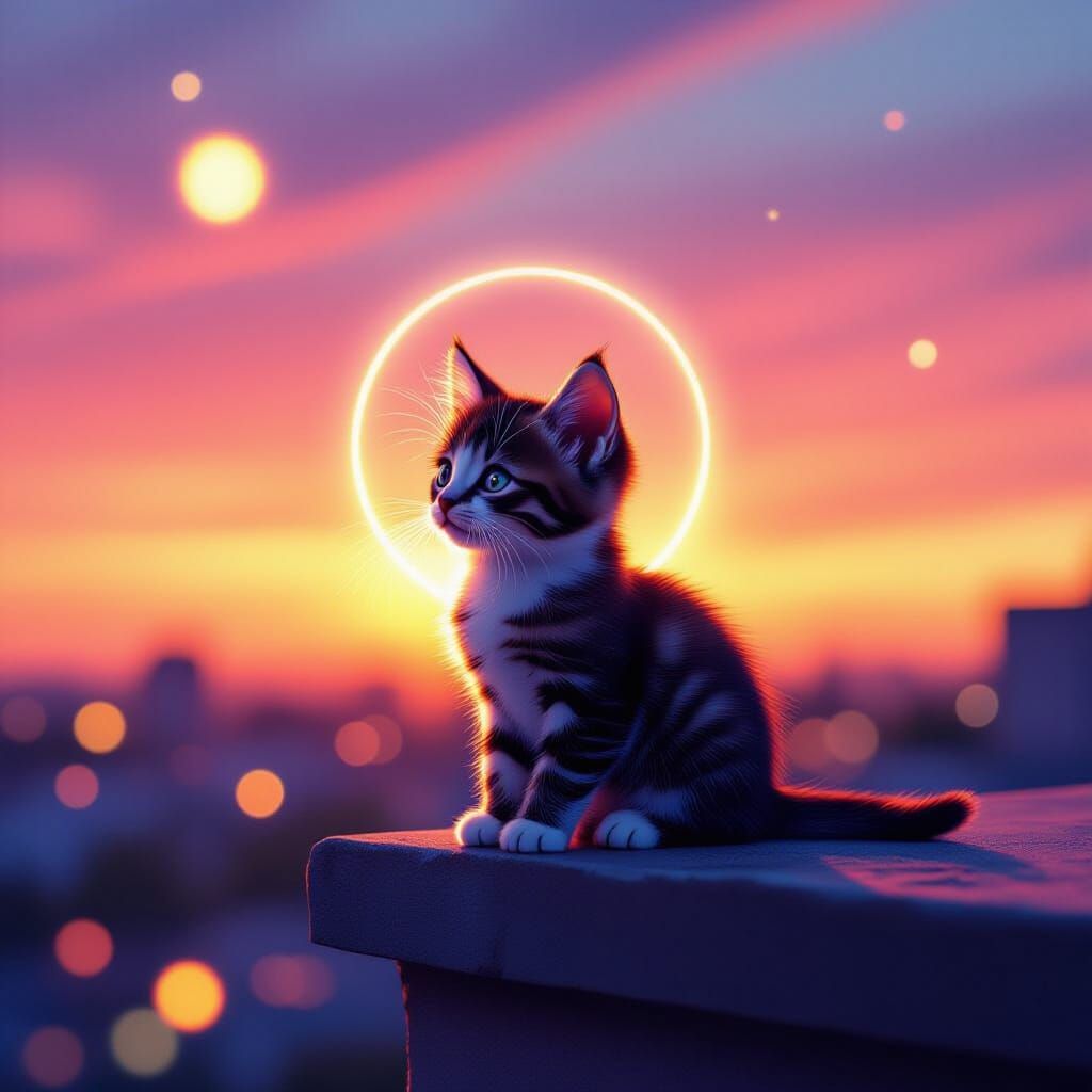 A striking picture of a kitten silhouetted on a rooftop at sunset. The surreal scene features a vibrant, colorful sky with glowing elements, rendered with shallow depth of field.