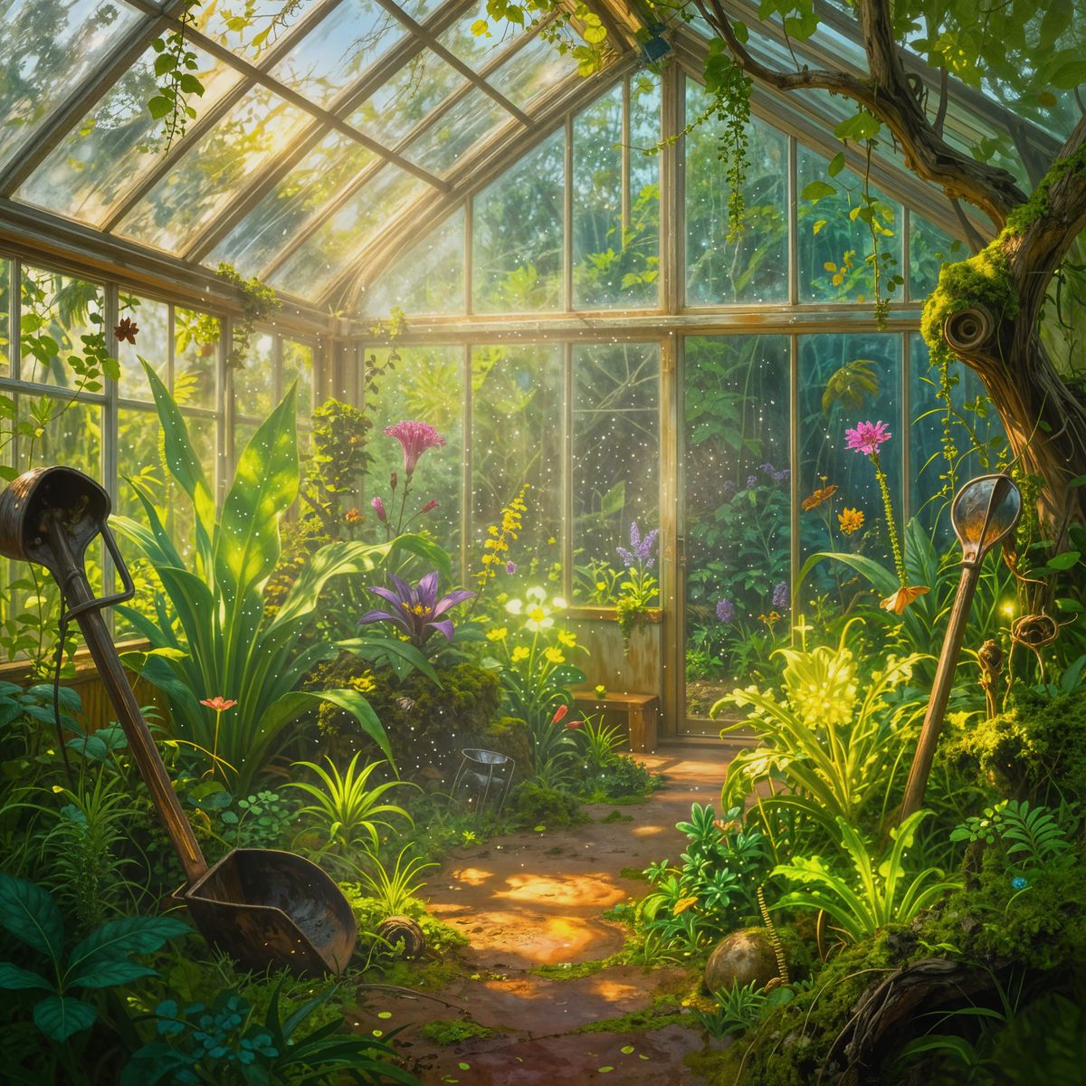 This image shows a whimsical, overgrown greenhouse filled with magical glowing plants and old gardening tools. Sunlight illuminates dust motes, creating a dreamlike atmosphere in a detailed, painterly style.
