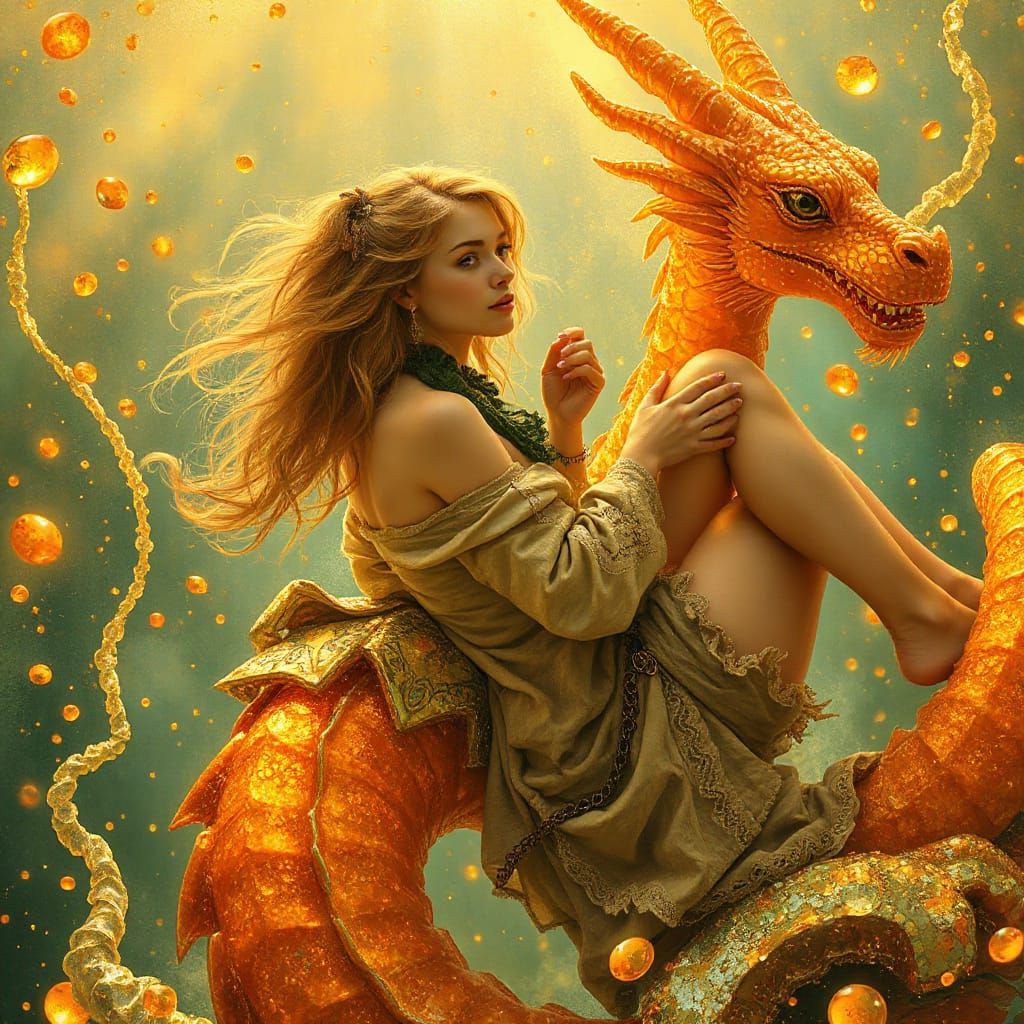 A serene woman with golden hair sits on a giant gummy dragon in a bubbly sea. The art blends fantasy, art nouveau curves, and neon accents.