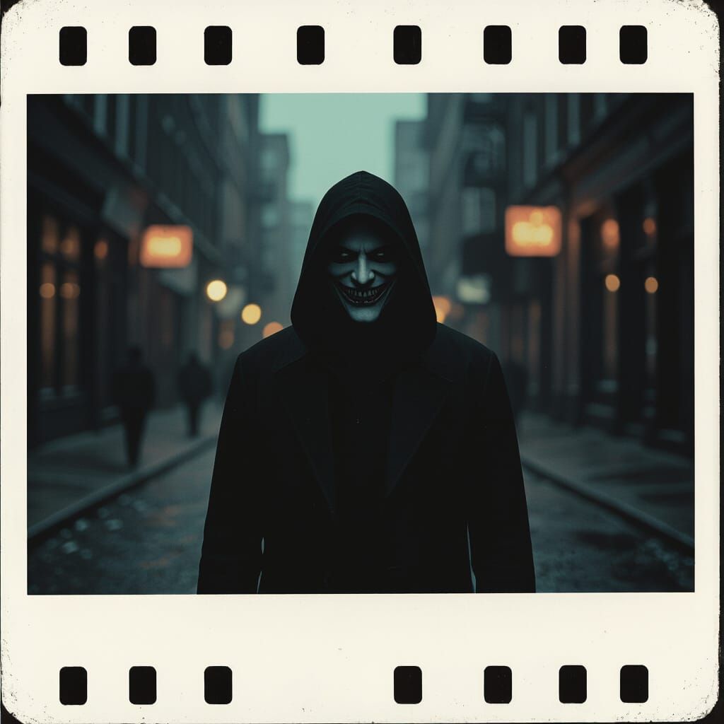 A cinematic film still captures a mysterious figure in black on a dark street, their face hidden except for a chilling smile. Shot with dramatic lighting and film grain for an epic, masterpiece quality.
