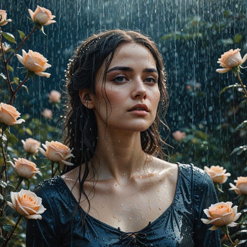 This surreal image captures a woman in a moody, soft-focus scene with a rain of dark ink-like roses. Rendered with ethereal watercolor and iridescent glow, it features deep blues and golds.