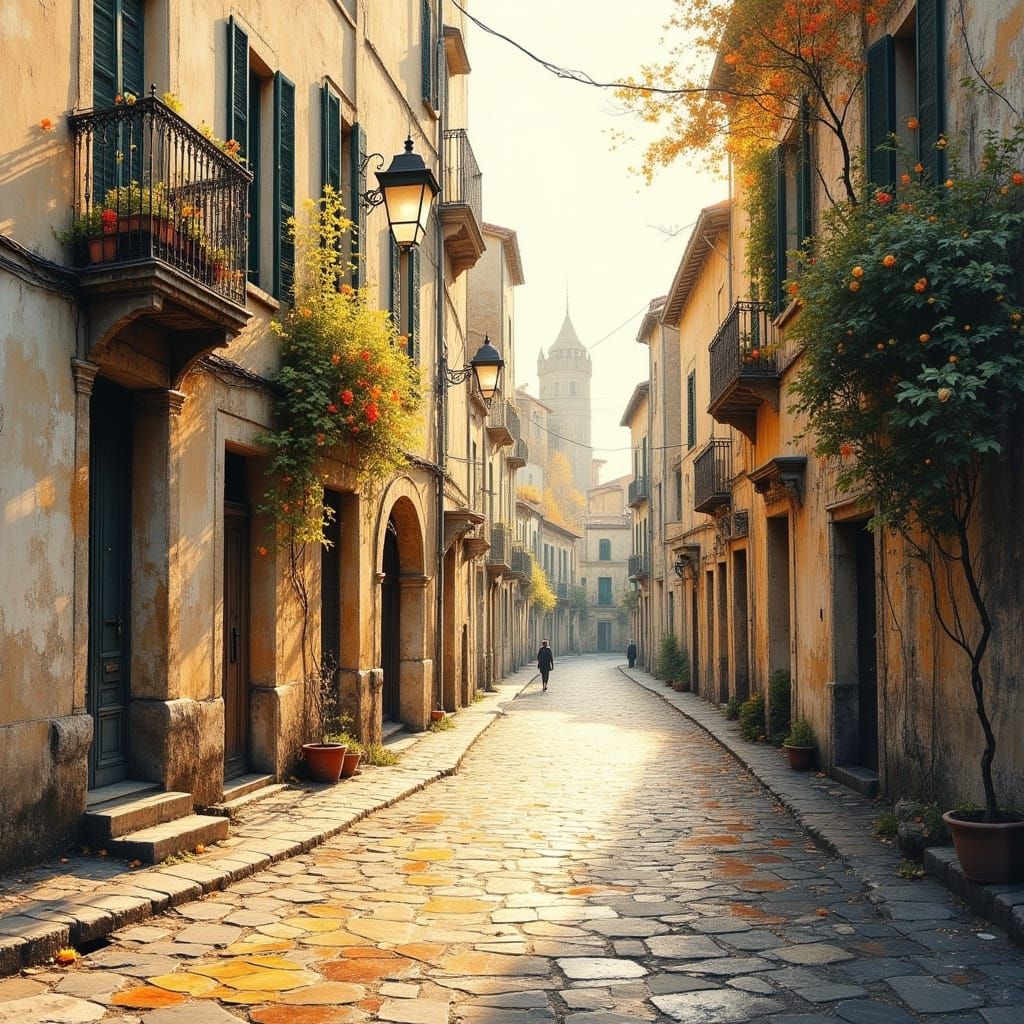 This image captures a vintage European street with a cobblestone road. Warm sunlight reflects on wet pavement, creating a dreamy and nostalgic atmosphere with loose, flowing paint.
