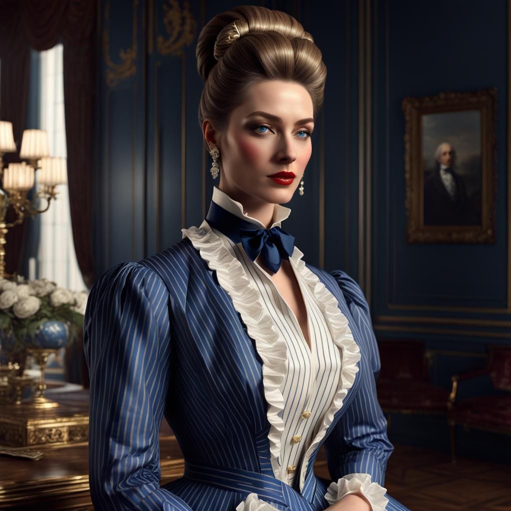 A portrait of a wealthy, upper-class woman from the nineteenth century. She is wearing a luxurious striped silk dress with a ruffled blouse, captured with volumetric lighting.