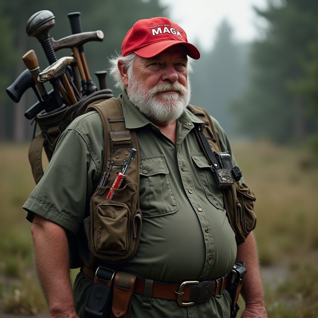 A hyperrealistic image of a rugged elderly man dressed in army gear, sporting a distinctive red cap and a bushy beard, with an AR15 rifle and a golf club bag slung over his back, set against a moody atmospheric backdrop