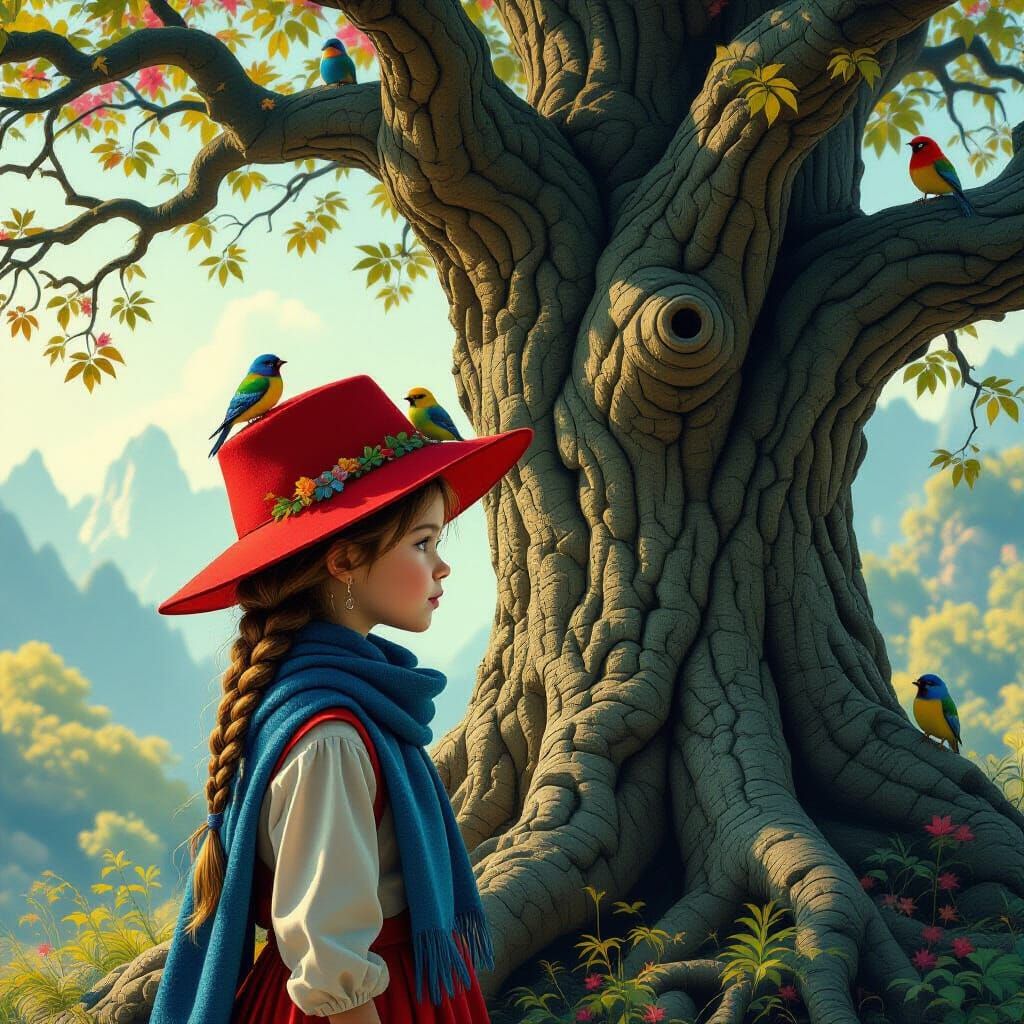A young girl with braided hair wears a red hat and a blue scarf, posing beside a tree. Birds perch on her hat and shoulder, creating a serene, whimsical atmosphere.