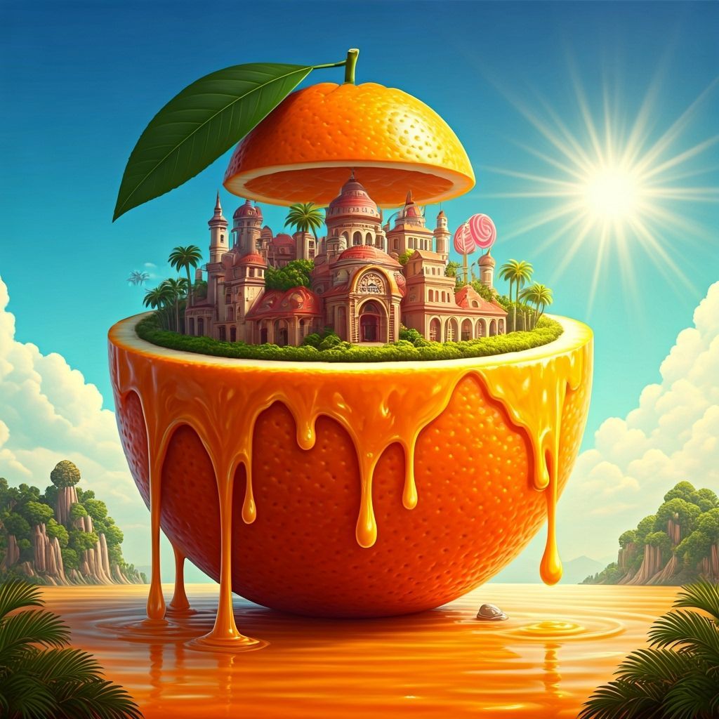 A hyperrealistic digital illustration of a giant orange sliced open, revealing a tiny city within. Set in a tropical locale with bright, vivid colors and dynamic lighting, this whimsical scene evokes a playful candy art aesthetic.