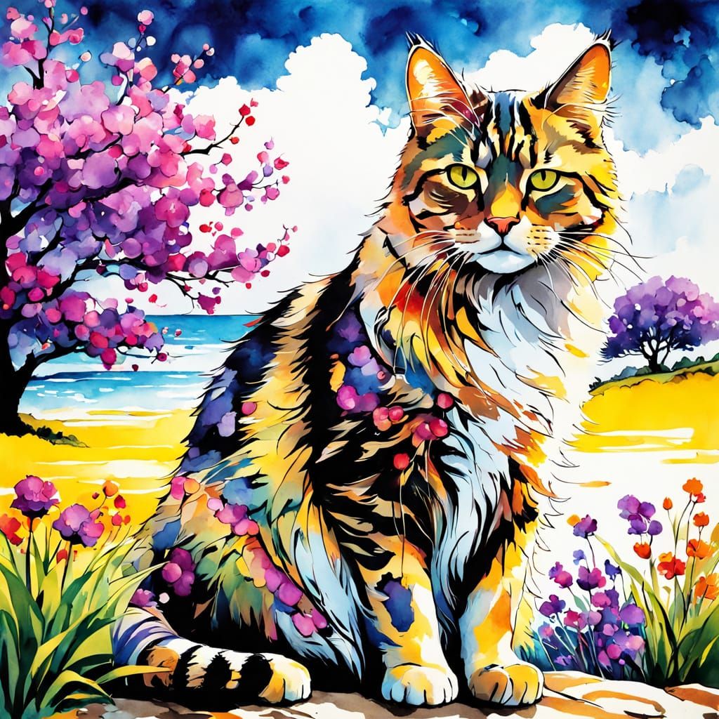 This ink wash watercolor illustration features a detailed tabby cat on a stone wall with blooming flowers, overlooking a serene beach and village during golden hour.