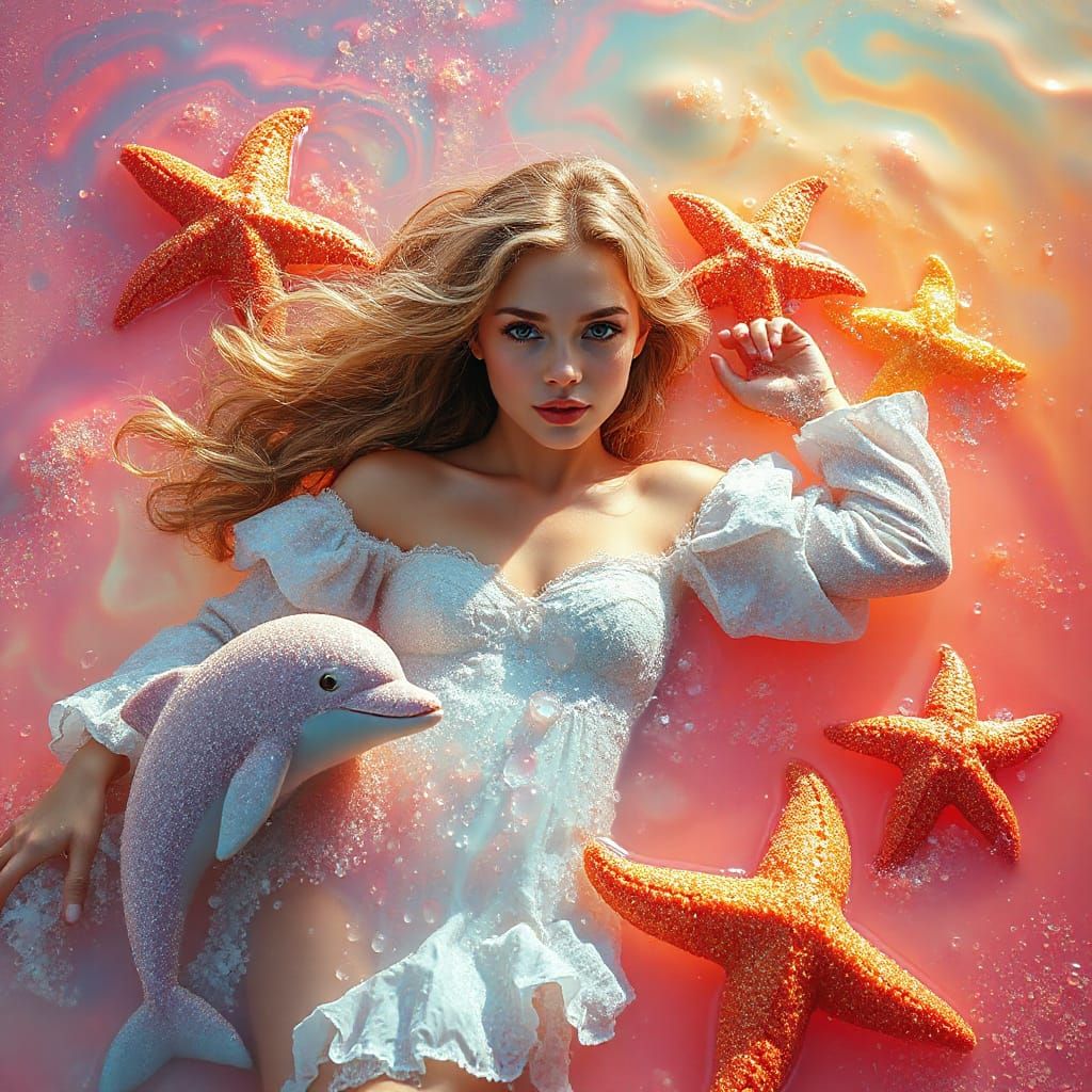 A dreamlike vista of a woman floating on soda, with candy dolphins and sugar starfish. Inspired by abstract expressionism and whimsical animation, with vibrant, glowing colors.