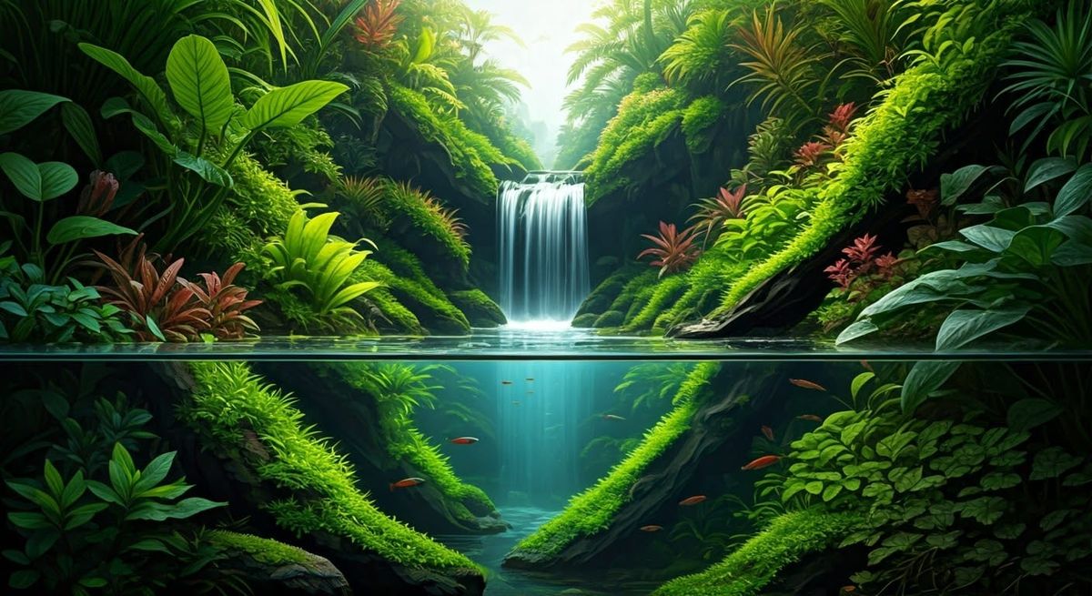 This breathtakingly realistic image captures the intricate details of a tropical freshwater paludarium, where lush greenery and vibrant aquatic plants thrive amidst a gentle mist, with a small waterfall blending the terrestrial and aquatic realms in perfect harmony.