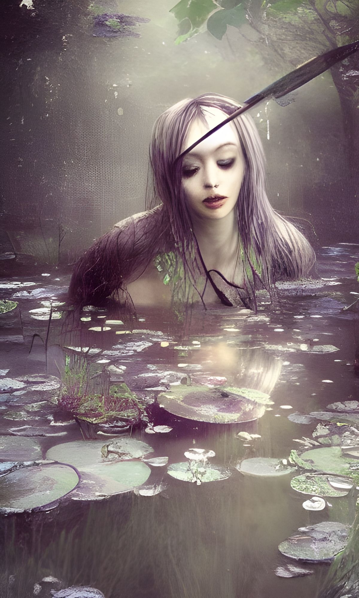 A striking picture of a swamp goddess in dark, still water. The image is a hyperrealistic mixed media illustration with 3D liquid detailing and subsurface scattering in a surreal and intricate aesthetic.