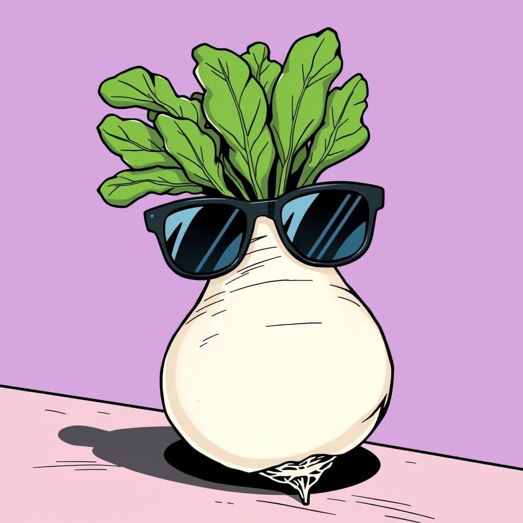 This image shows a daikon radish wearing sunglasses in a comic book style. The overall aesthetic makes it suitable for use as a wallpaper.