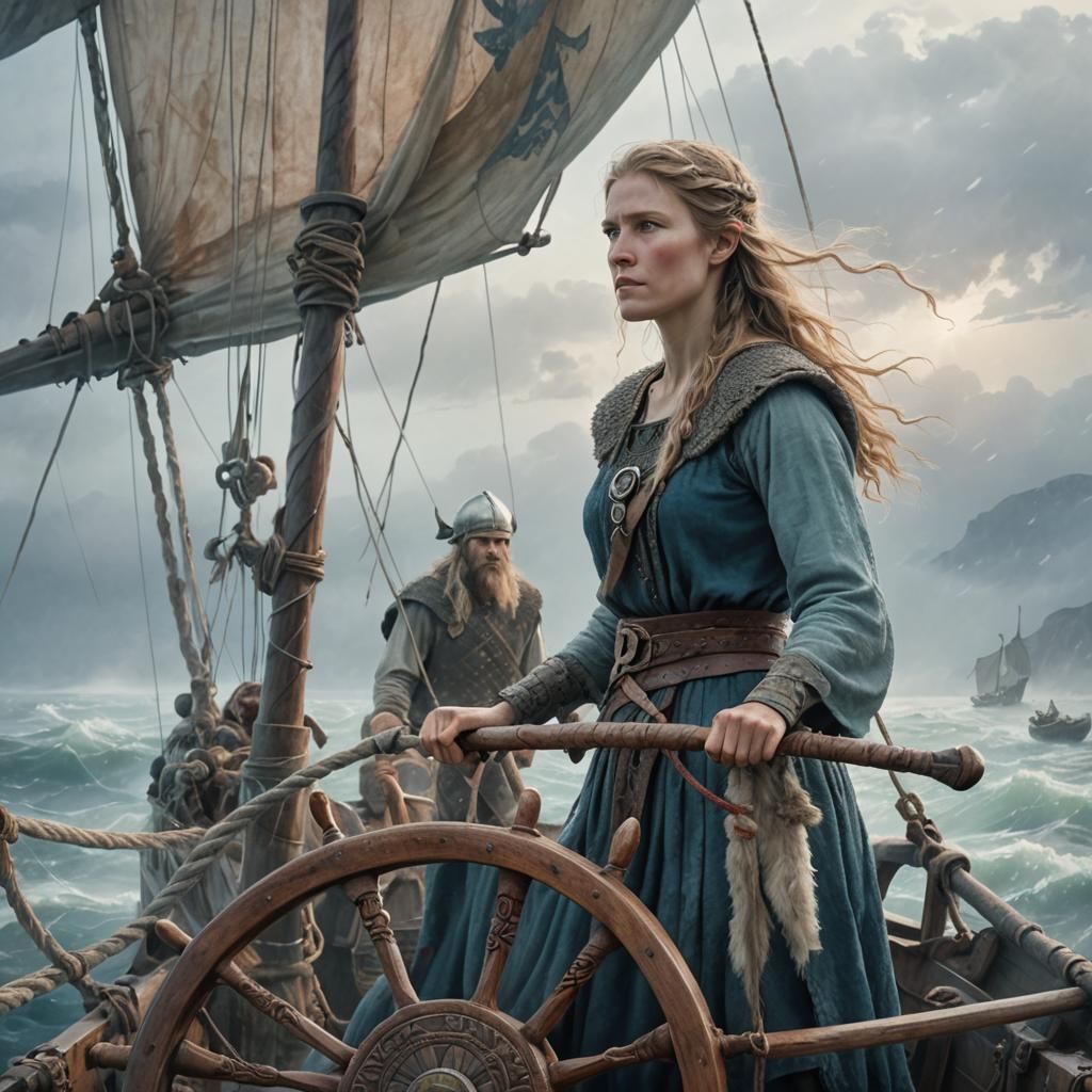 A striking picture of a Viking woman at the helm of a longship. The misty sea background and soft, diffused light create a dreamy, ethereal atmosphere in a post-impressionist style.