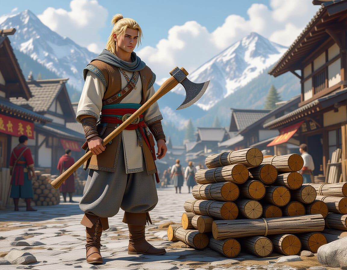 This image shows a blonde, blue-eyed young man with an axe standing next to stacked firewood. Villagers surround him against an alpine backdrop blending Saxon and Japanese architecture, rendered as a detailed matte painting.