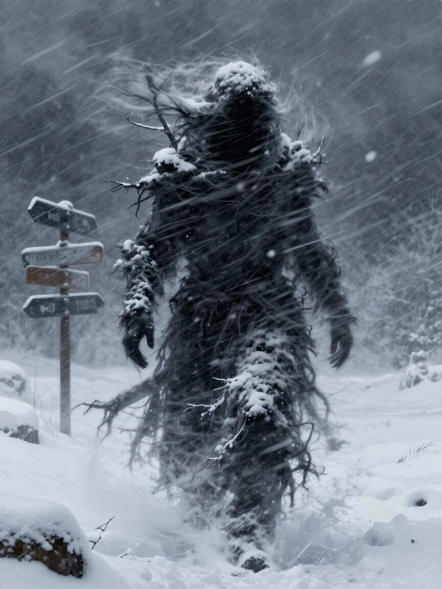 This image depicts a Slavic blizzard spirit, a faceless humanoid formed from snow and wind, emerging from a dramatic snowstorm. Rendered in a surreal folklore art style with high contrast and ultra-detailed textures.