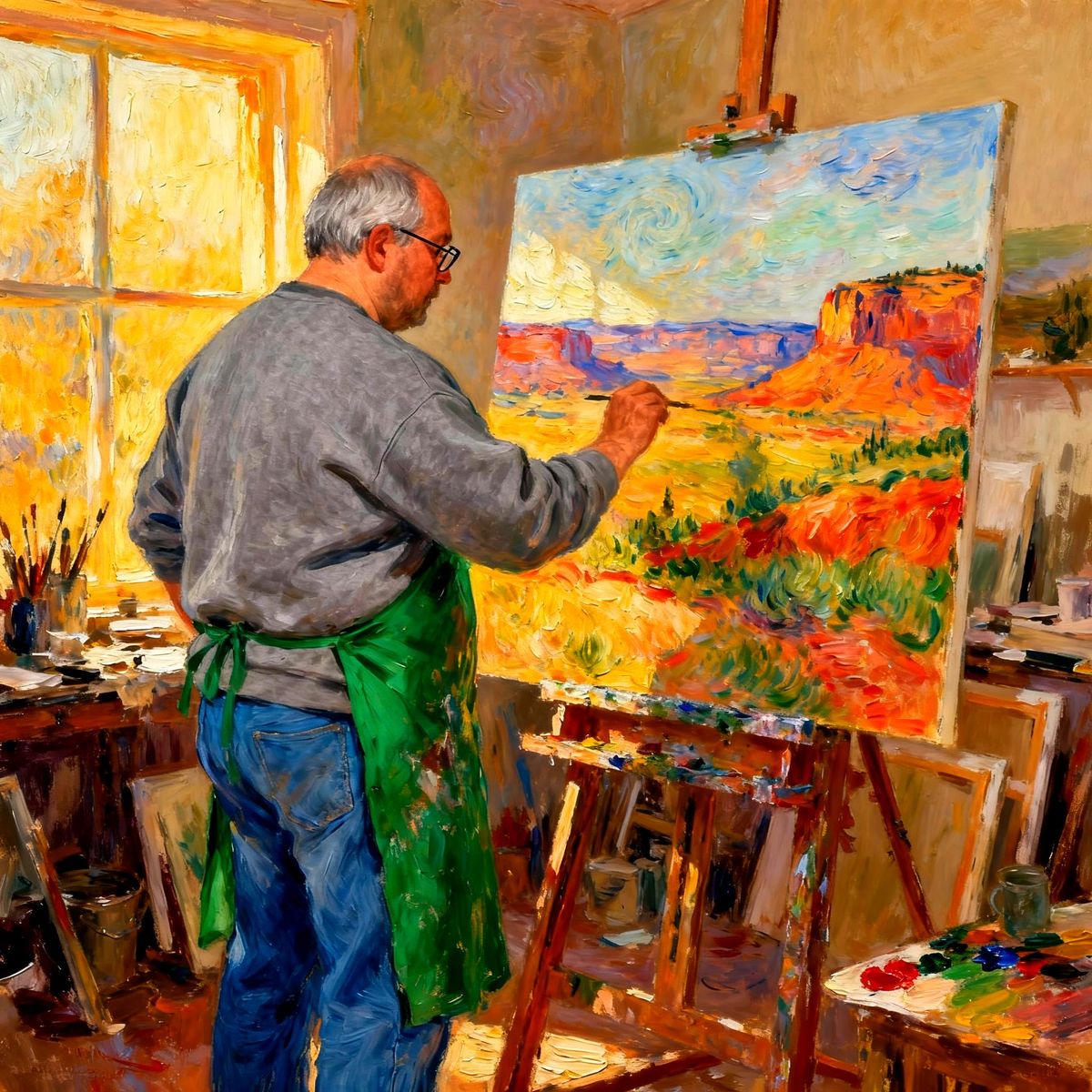 This image shows an impressionistic oil painting of a man painting a western landscape in a messy art studio. Features visible brushstrokes and a rich color palette.