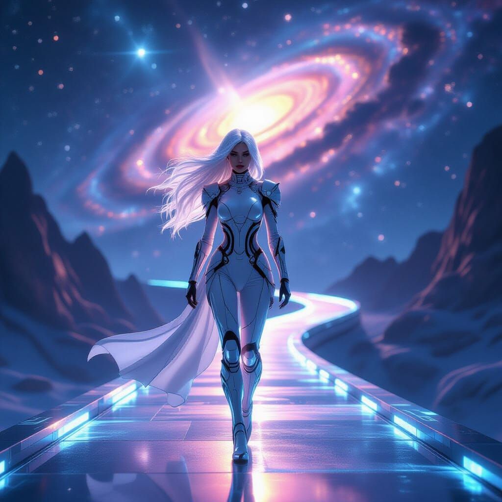 A stunning image of a cybernetic woman with white hair on a glowing path. The cosmic background features a spiraling galaxy and nebulae, all rendered in ultra-realistic cinematic style.