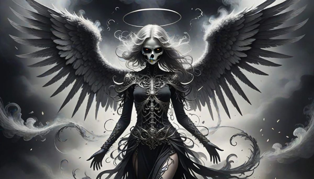 This image shows a beautiful, fashionable angel of death with dark, luxurious wings and swirling silver smoke emanating from within, creating a hauntingly elegant scene
