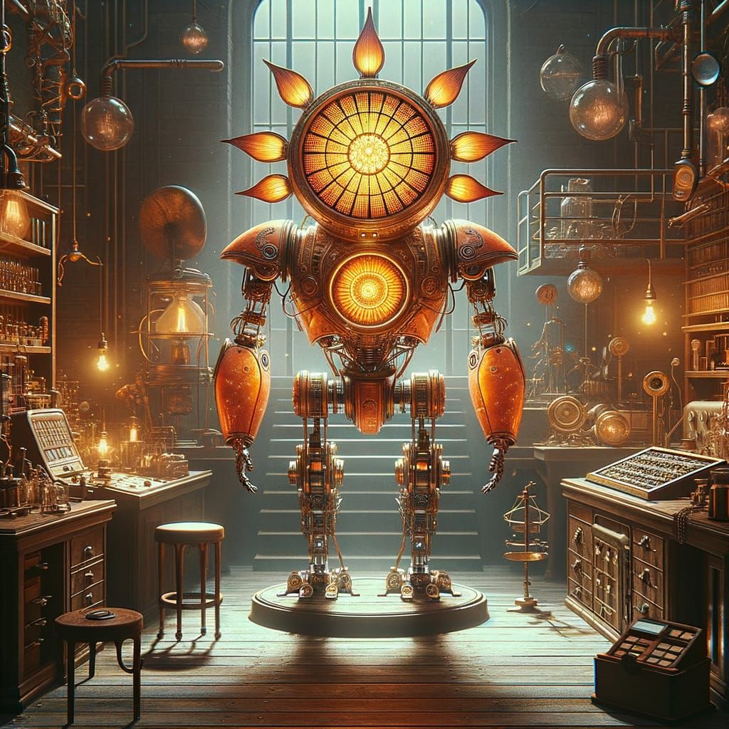 This image depicts a stunning, orange solar-powered robot in a vintage laboratory, blending old-world charm with futuristic technology. It looks like a legendary artifact.