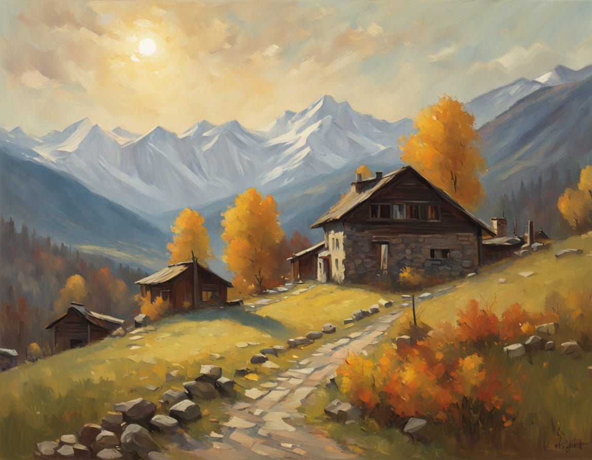 An oil painting of an Alpine village in october. Isaac Levitan style. Masterpiece. Excellent pictorial compocition.