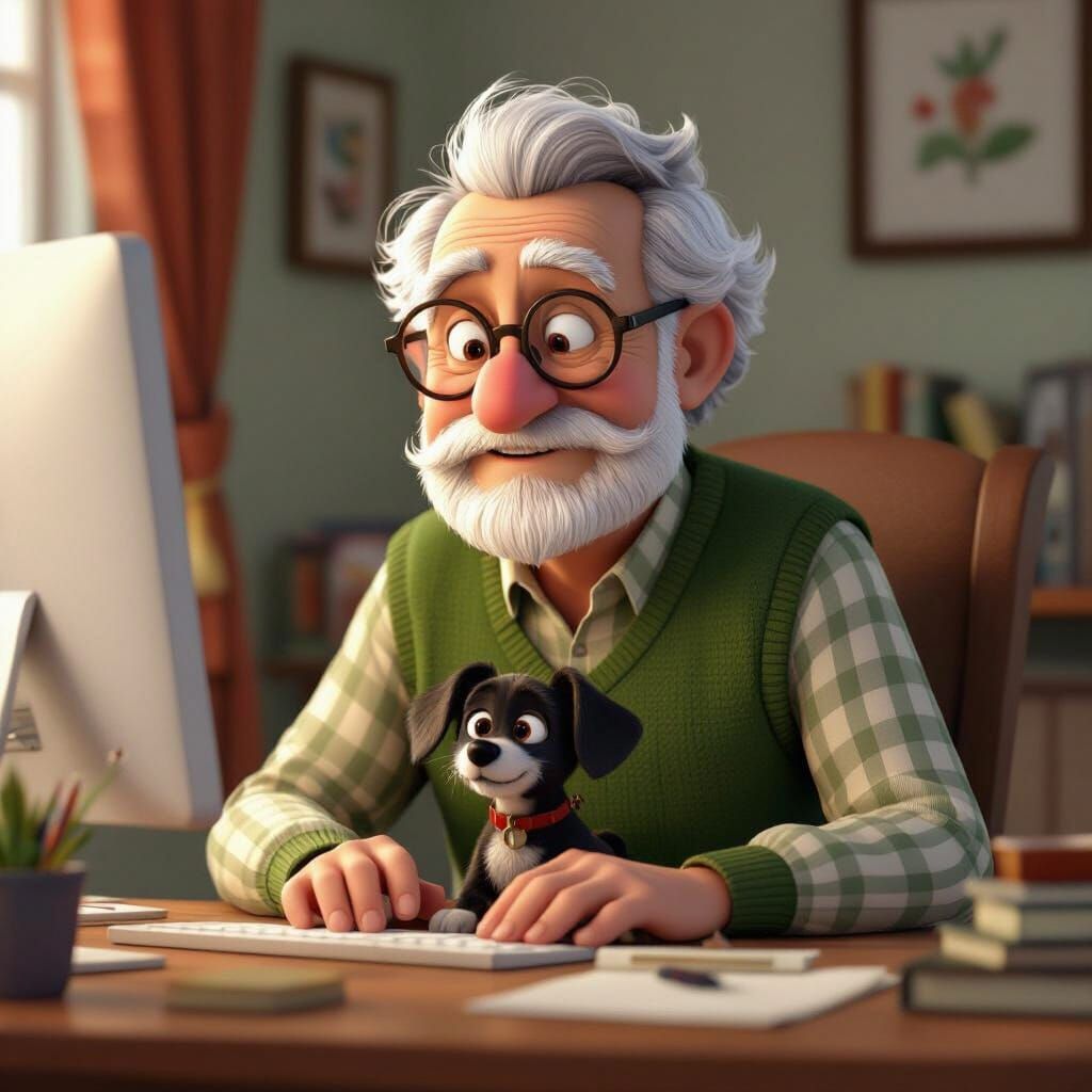 This image shows an elderly man with white hair and glasses sitting at his desk with a small dog on his lap, rendered as 3D digital art. The scene features vibrant colors and cinematic lighting, reminiscent of Pixar animation.