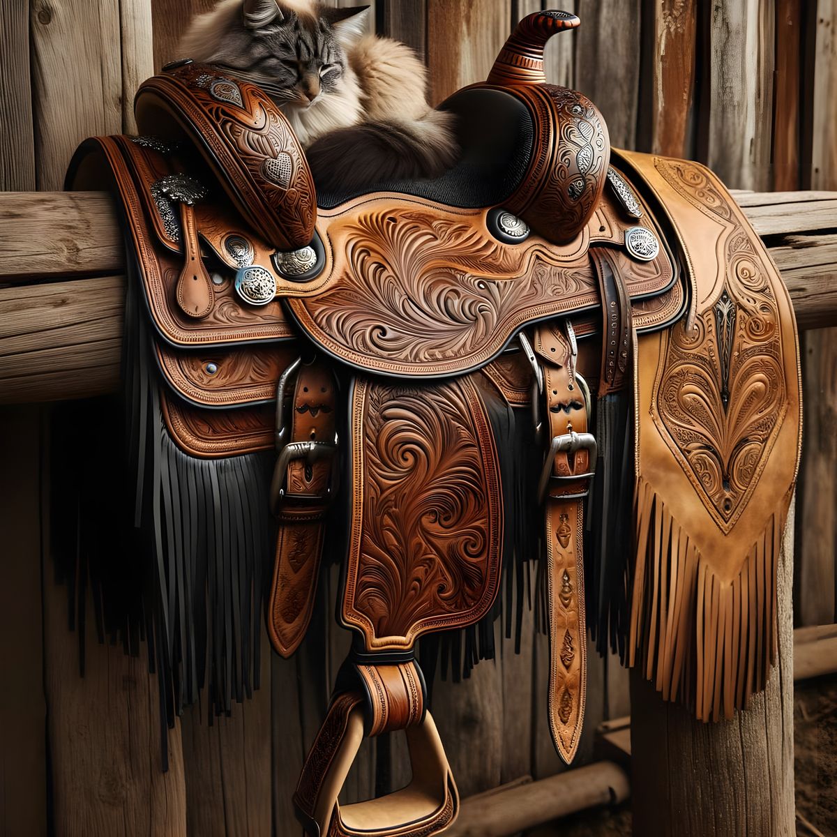 This image shows a cream-colored cat asleep on an ornate Western saddle and chaps draped over a wooden fence. The saddle and chaps feature embossed leather patterns and silver embellishments. The backdrop is a rustic barn.