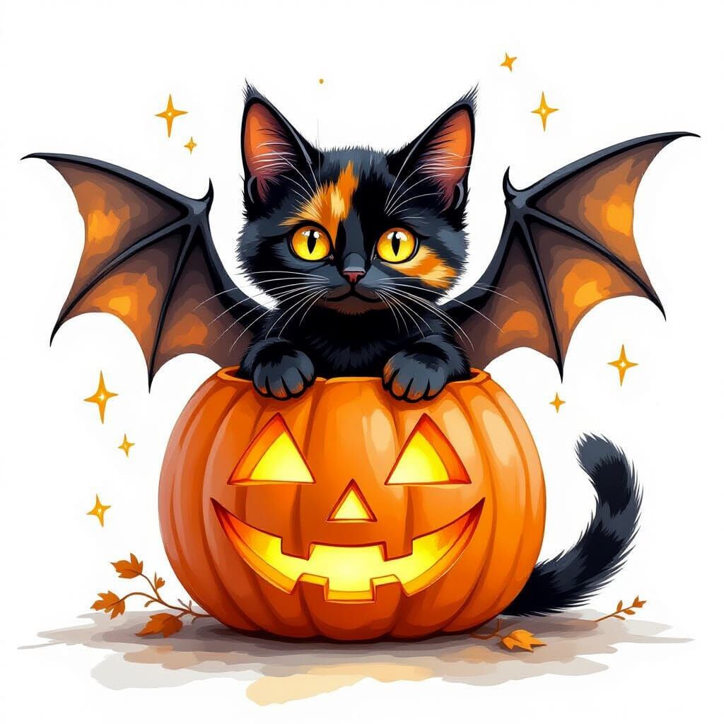 This image shows a lit Jack O'Lantern with a happy face, and a black and orange cat with glowing bat wings, as whimsical watercolor art. Soft brushstrokes and vibrant colors bring this digital painting to life.
