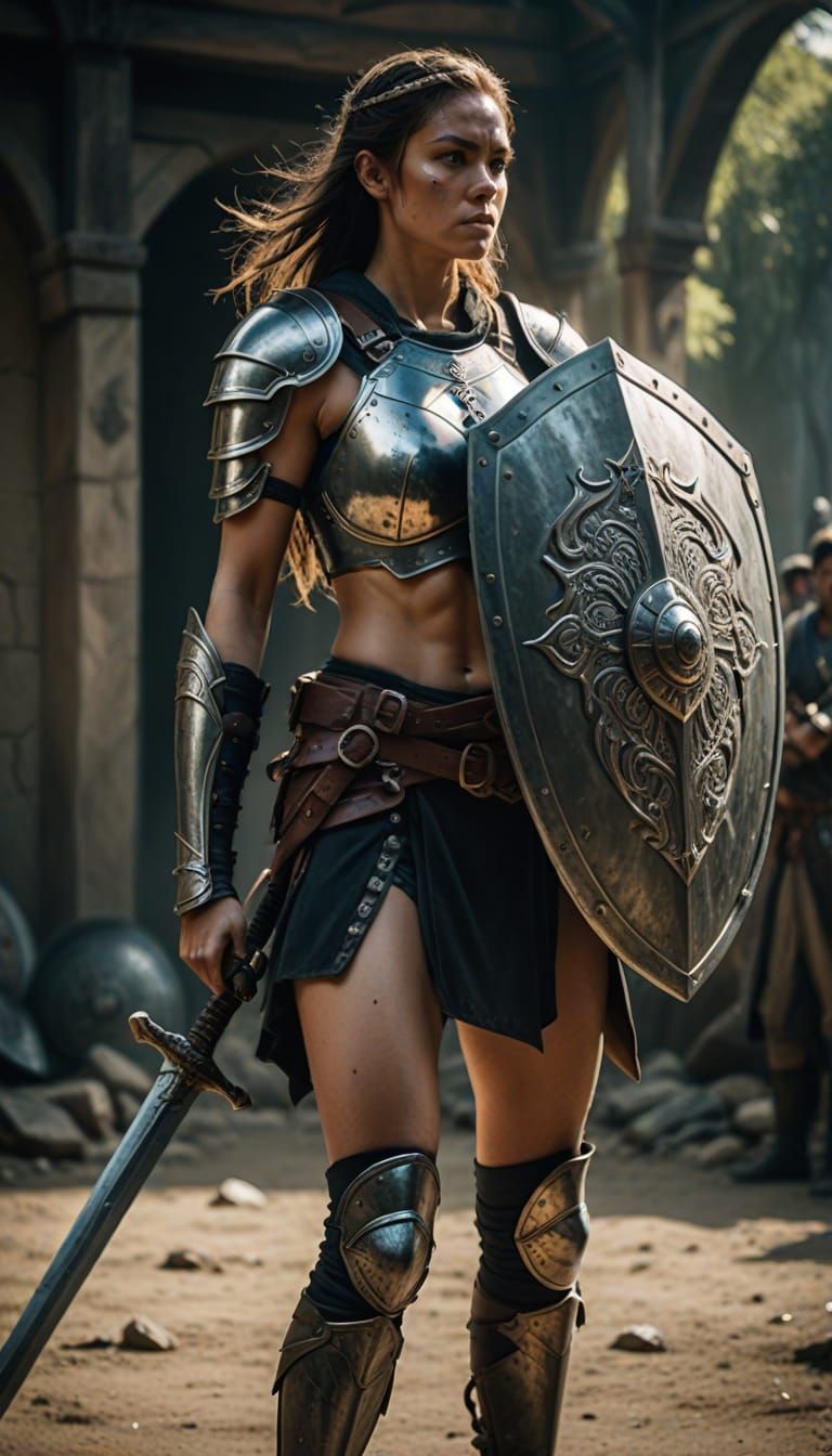 This image shows a beautiful, athletic young warrior princess in sports bra armor, holding a sword and shield. The scene is dramatically lit with a cinematic aesthetic.