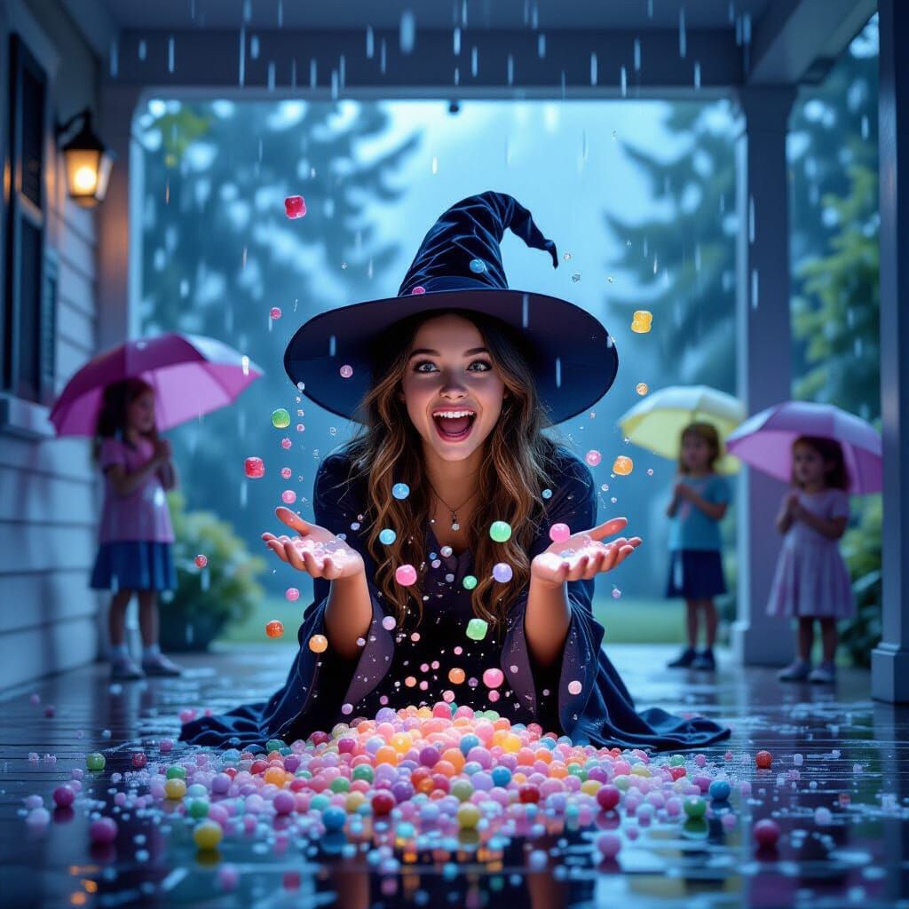 This image shows a young witch on a porch during a rainstorm, magically turning raindrops into gummy bears and candy. Captured in a photorealistic style with cinematic lighting.