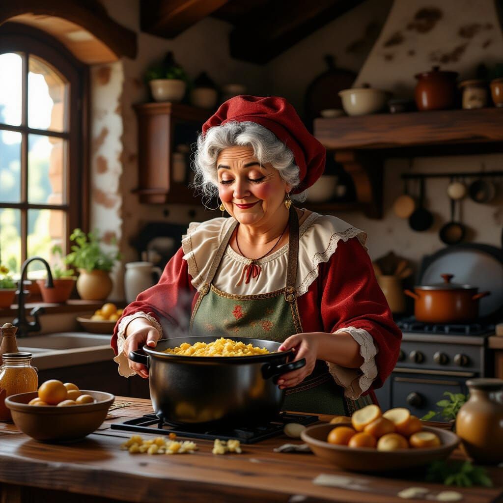 This image features Strega Nona in her rustic kitchen, depicted as a detailed portrait. The art style is reminiscent of dynamic concept art with intricate details and volumetric lighting.