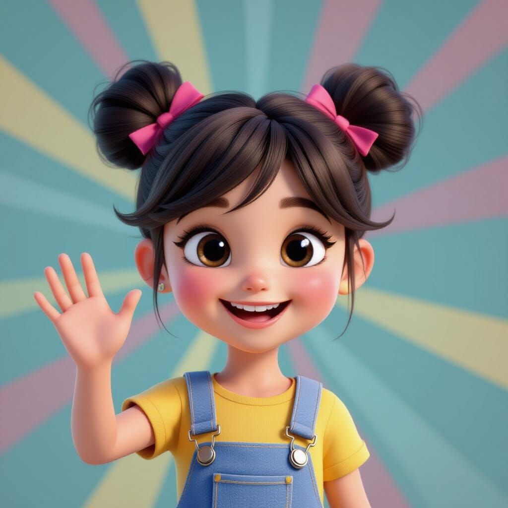 This image shows a happy young girl with pigtails waving hello. Rendered in a vibrant 3D digital art style with cinematic lighting and a colorful gradient background.