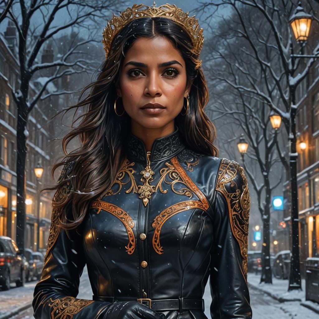 A hyper-realistic portrait of a queen in a snowstorm, adorned with gold jewelry. The image blends Art Nouveau with neoclassical metallic elements, featuring a dramatic, triadic color scheme with gothic undertones.