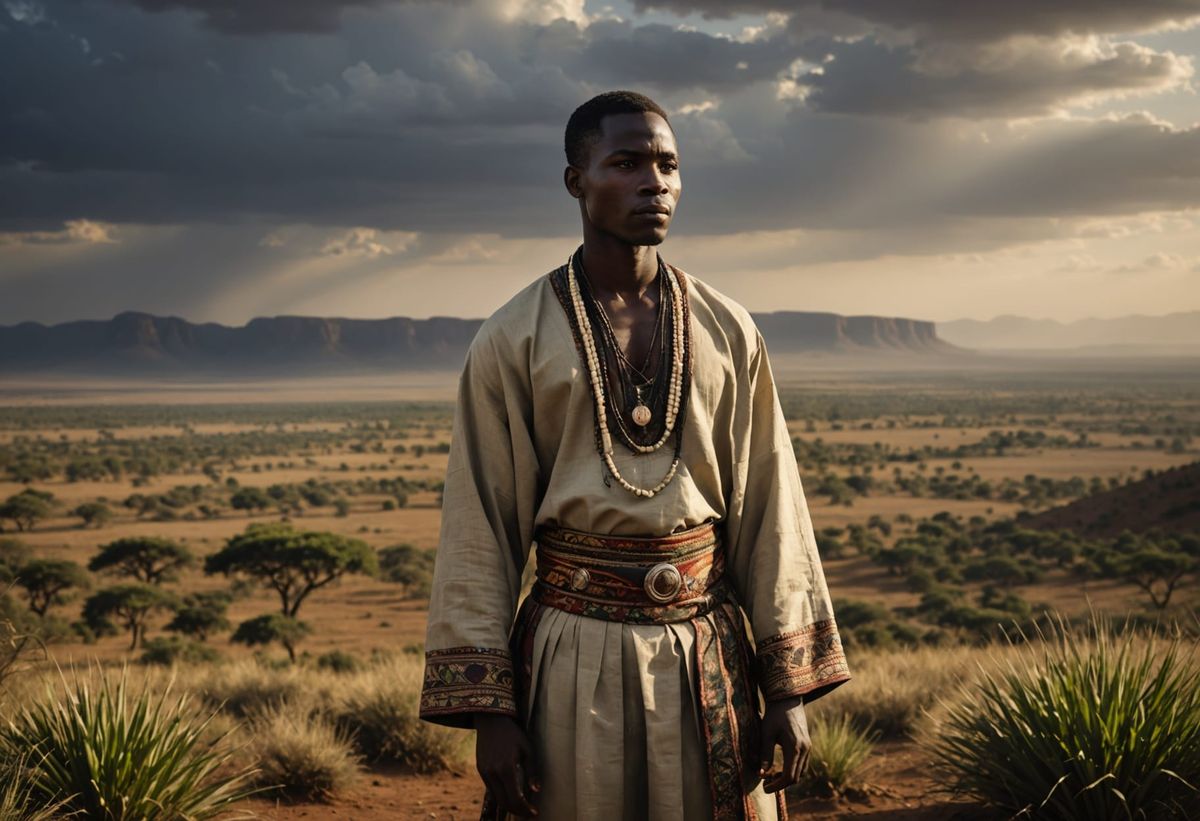 This image shows a young African man in traditional attire, standing proudly amidst a vast, dreamlike landscape. Dramatic chiaroscuro lighting enhances the hyperrealistic photography, emphasizing cultural authenticity and serene strength.