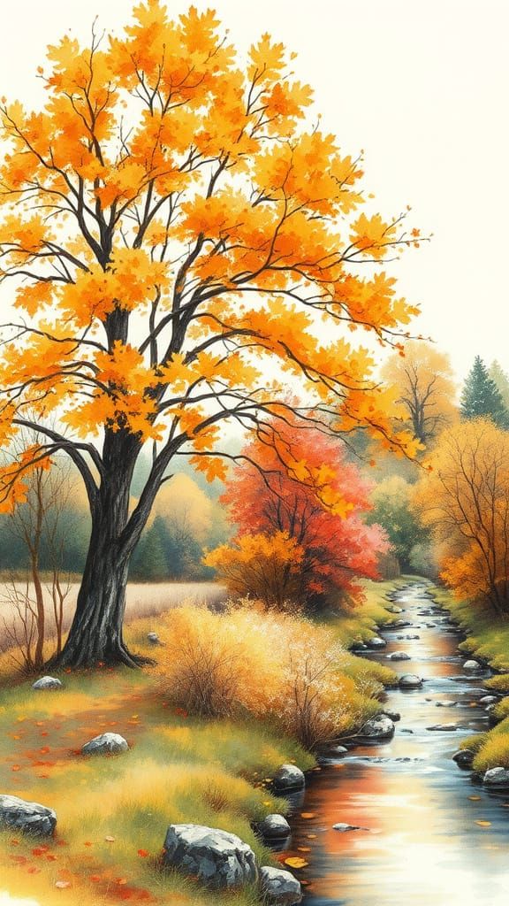 A vibrant watercolor painting of an autumnal landscape. The image depicts a large tree with colorful foliage beside smaller trees, shrubs, and a stream reflecting the light in a serene aesthetic.