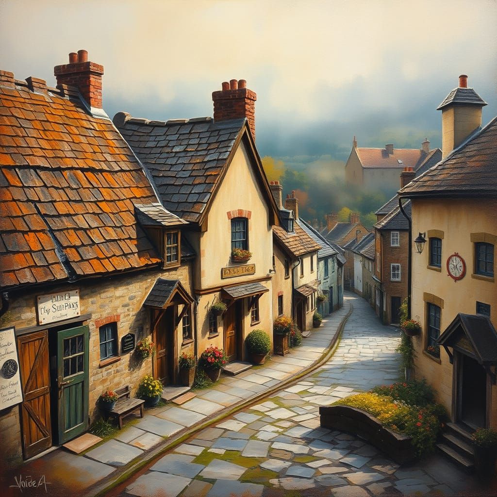 This image shows a rustic Welsh farmstead in autumn, featuring weathered textures and earthy tones. It is surrounded by colorful shops and buildings in an impasto style, with warm hues and an ethereal glow.