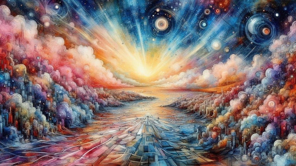 A vibrant, dreamlike landscape featuring surreal textures and vivid colors. The image captures an abstract and dreamlike scene illuminated by soft morning light, in a colorful ink lithography style.